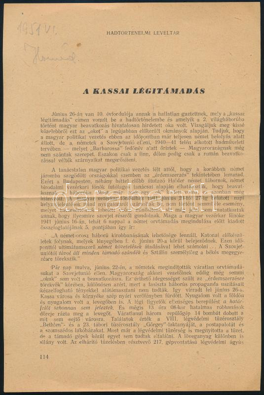 1951 A Honvéd c. folyóirat 1951. évi 6. számának egy lapja, a kassai légitámadás 10. évfordulóján a bombázásról megemlékező írással (töredékes szöveg)