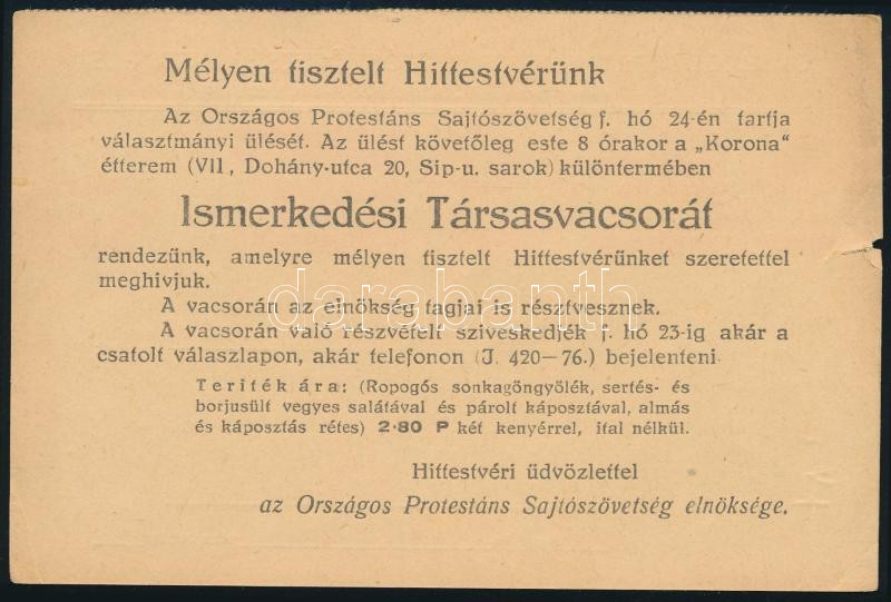 cca 1930 Meghívó az Országos Protestáns Sajtószövetség ismerkedési társasvacsorájára, kis sérüléssel