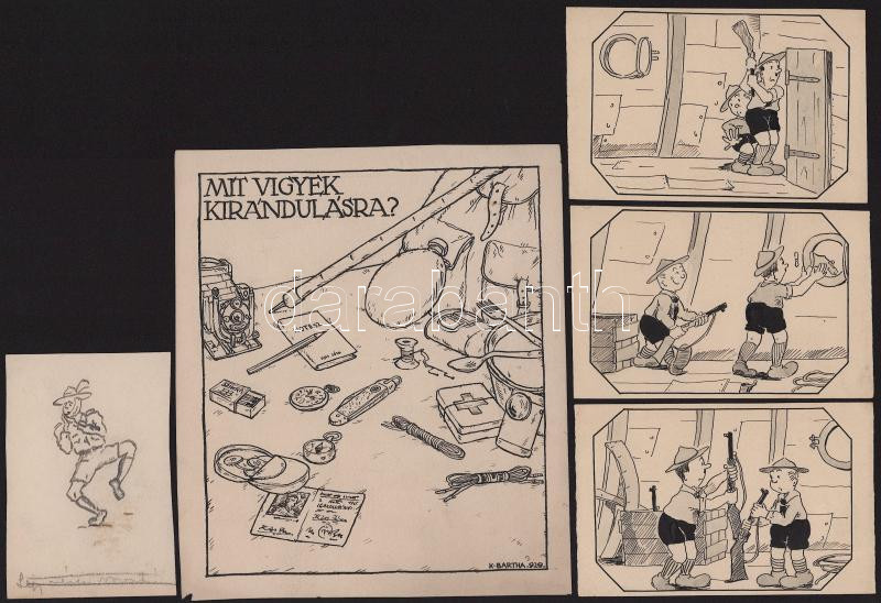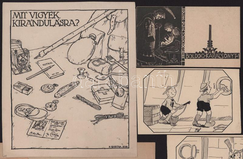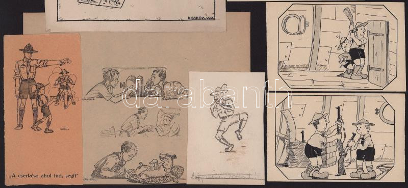 ca 1930-1940 10db cserkész grafika, nagyrészt egyedi rajz, több hátulján nyomda jelekkel, ami azt jelzi, hogy megjelent grafikák, több alkotótól. 14x16 cm-ig.