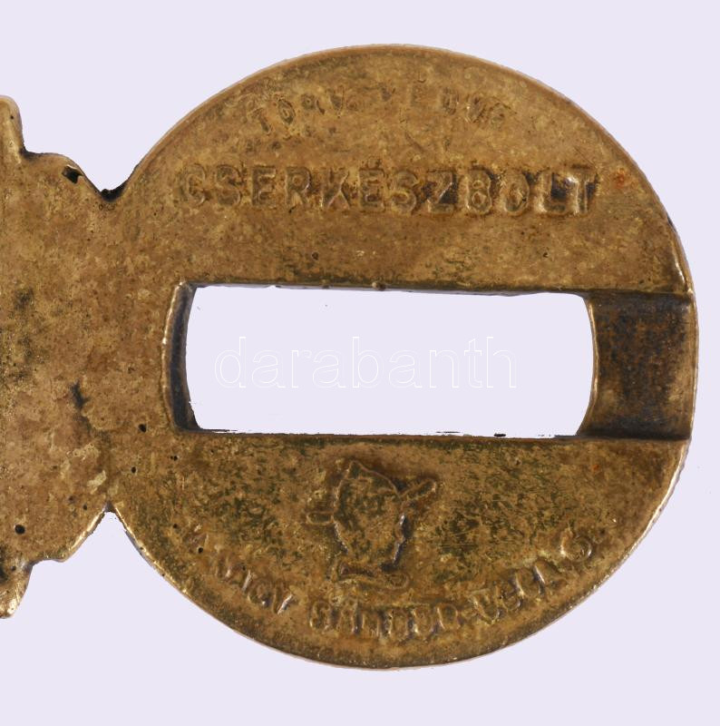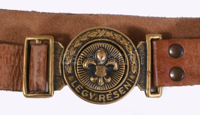 cca 1930-1940 "Légy résen!" feliratú cserkész övcsat, réz, Cserkészbolt jelzéssel, 5x9 cm