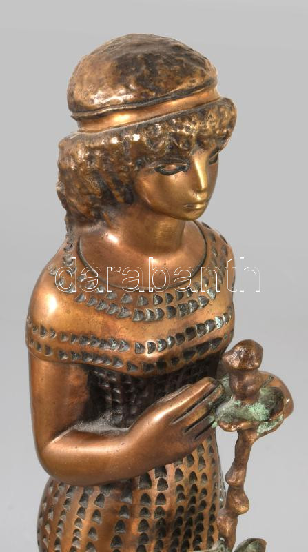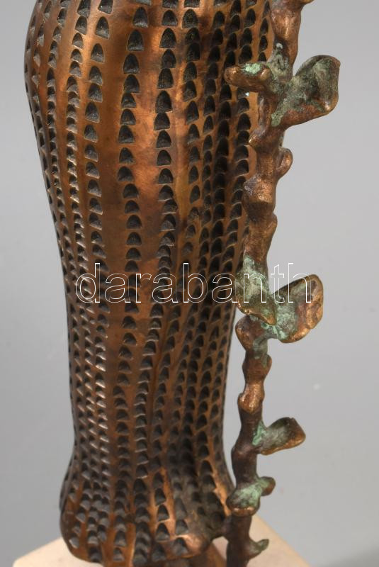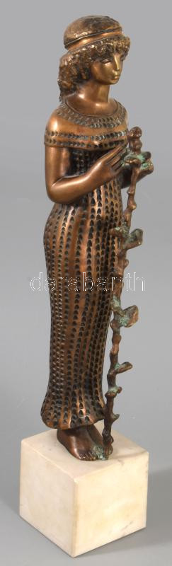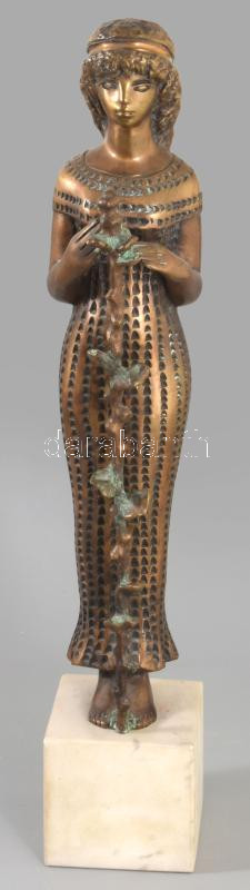 R. Kiss Lenke (1926-2000): Lány virággal. Öntött bronz, márvány talapzaton, jelzett: ruhája alján, KL monogrammal. Alján Képcsarnok címkével, m: 33 cm, 40 cm.