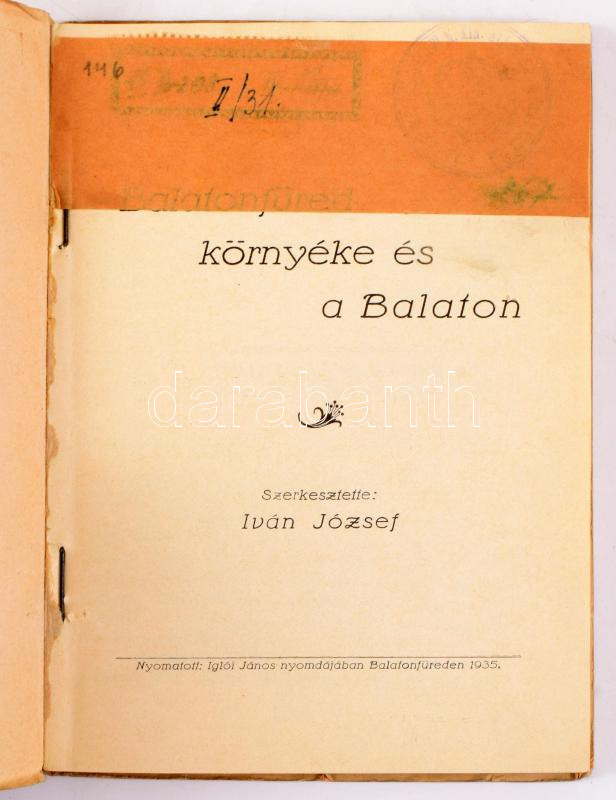 Iván József: Balatonfüred környéke és a Balaton. Szerk.: - -. Balatonfüred, 1935, Iglói János, 144 p. + 3 kihajtható térkép, az egyik elszakadt. Fekete-fehér szövegközti fotókkal illusztrált. Kiadói papírkötés.