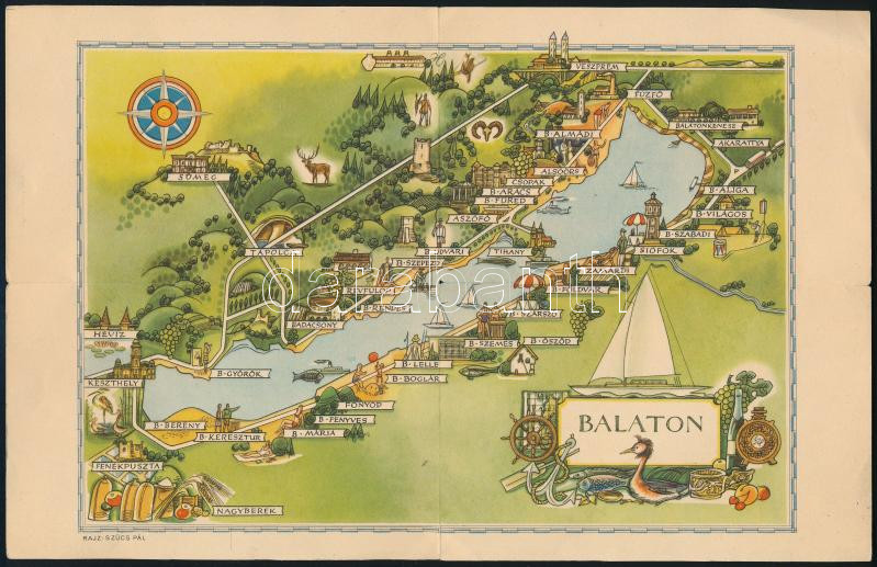 cca 1960 Balaton grafikus térképe, rajzolta: Szűcs Pál, Bp., Képzőművészeti Alap (Offset-ny.), hajtva, 18x28 cm