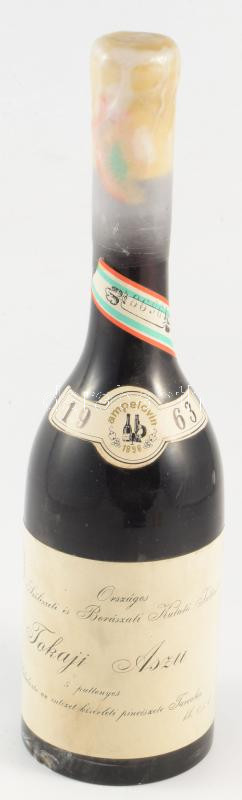 1963 Tokaji Aszú, 5 puttonyos, Tarcal, Országos Szőlészeti és Borászati Kutatóintézet, bontatlan palack, édes, fehér desszertbor, a palack fejét később leviaszolták, 0,5l
