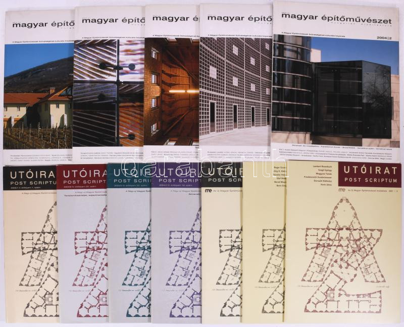 2004-2005 Régi-Új Magyar Építőművészet c. építészeti folyóirat 5 db száma (2004/2., 2004/4., 2004/6., 2005/1., 2005/2.) + 2001-2005 Utóirat / Post Scriptum, a Régi-Új Magyar Építőművészet melléklete 7 db száma