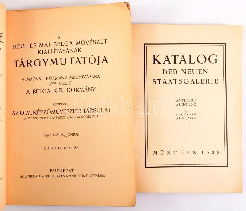 A régi és mai belga művészet kiállításainak tárgymutatója. A magyar kormány meghívására szervezte a belga kir. kormány. Rendezte az O. M. Képzőművészeti Társulat a Szinyei-Merse-Társaság közreműködésével. 1927 május, június. Bp.,1927, Athenaeum. Gazdag egészoldalas, fekete-fehér képanyaggal illusztrálva. Magyar és francia nyelven. Kiadói papírkötés. + Katalog der neuen Staatsgalerie. München, 1925, (Carl Gerber-ny.) Német nyelvne. Fekete-fehér képanyaggal illusztrált. Kiadói papírkötés.