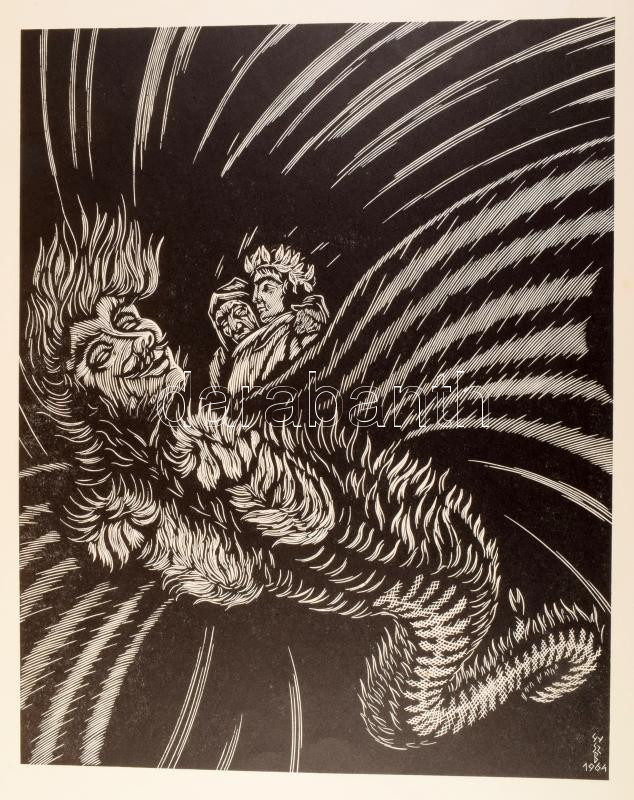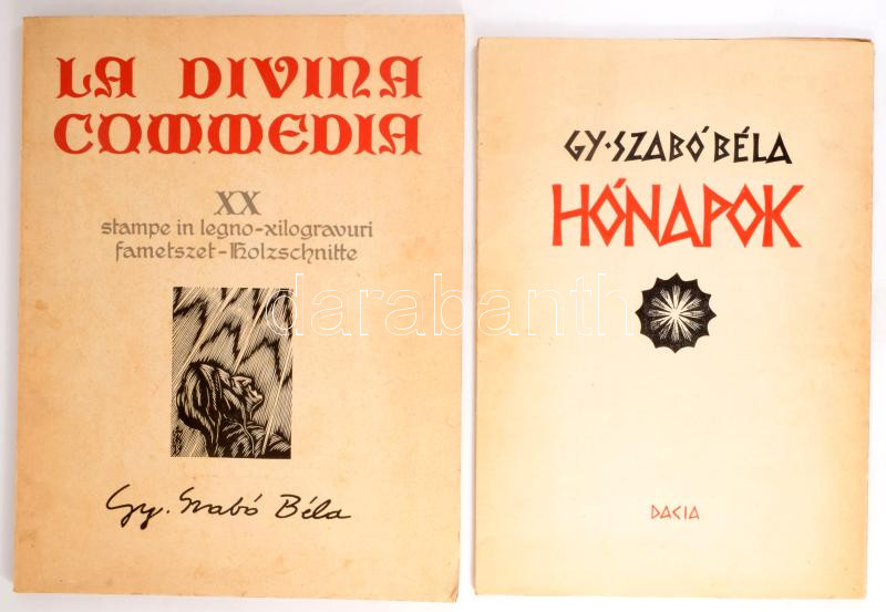Gy. Szabó Béla 2 műve: Dante Alighieri: La Divina Commedia. Kolozsvár, 1976, Dacia. Gy. Szabó Béla 20 db fametszetével illusztrálva. Magyar, olasz, román és német nyelven. Kiadói papírkötés, 43,5x33,5 cm. + Gy. Szabó Béla: Hónapok. Gy. Szabó Béla (1905-1985) fametszetei. (Kolozsvár, 1973), Dacia. Kiadói papírkötésben, 42x30 cm.