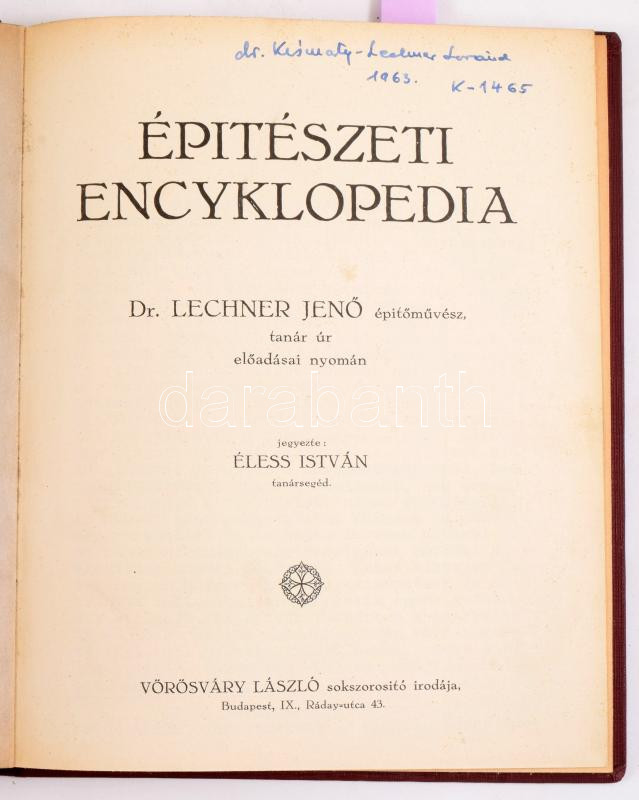 Lechner Jenő: Építészeti encyklopédia. dr. Lechner Jenő építőművész, tanár úr előadásai nyomán jegyezte Éless István tanérsegéd. Bp., 1930. Vörösváry László. 50 p ., + hozzákötve: Építészeti encyklopédia képekben. 27t. Kismarty Lechner Lóránd tulajdonos névbejegyzésével. Egészvászon kötésben