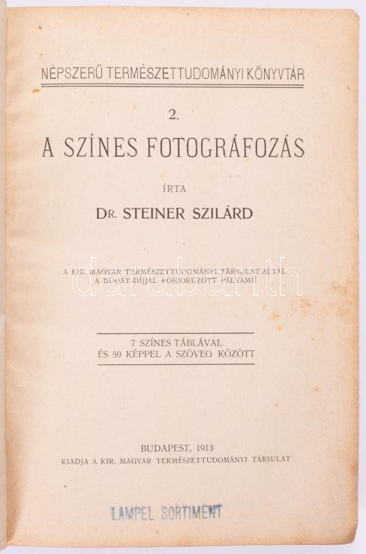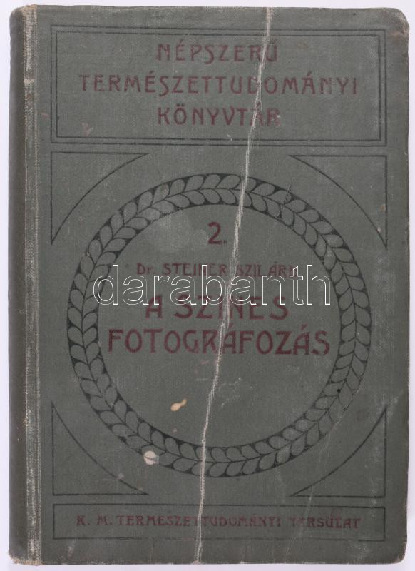 Steiner Szilárd: A színes fotográfozás. Népszerű Természettudományi Könyvtár 2. Bp., 1913, K. M. Természettudományi Társulat. 265p. Gottermayer-kötésben. Kiadói egészvászon kötés, viseltes állapotban.