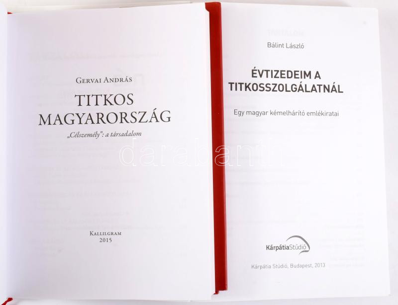 2 db könyv - Gervai András: Titkos Magyarország. "Célszemély": a társadalom. 2015, Kalligram. + Bálint László: Évtizedeim a titkosszolgálatnál. Egy magyar kémelhárító emlékiratai. Bp., 2013, Kárpátia. Papír és kartonált kötés, jó állapotban.
