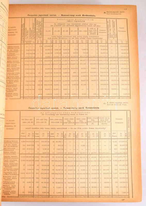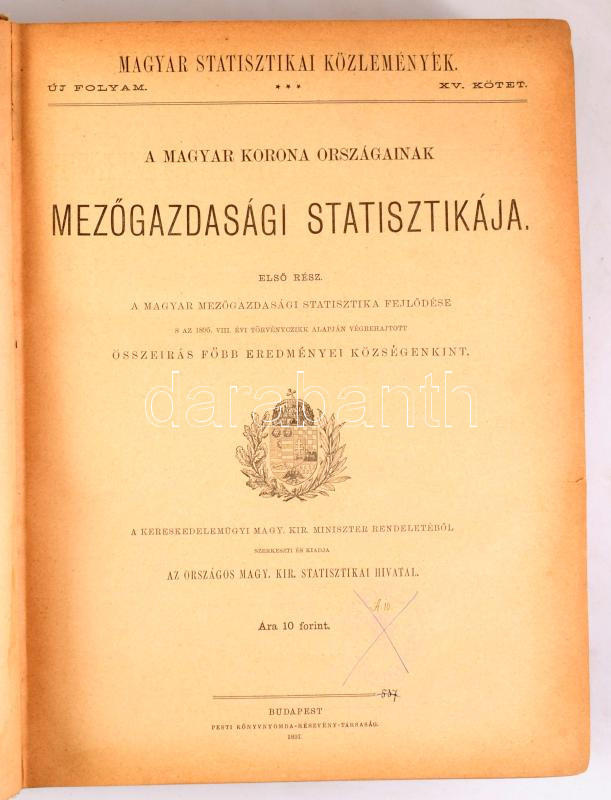 A Magyar Korona országainak mezőgazdasági statisztikája. I. rész. A magyar mezőgazdasági statisztika fejlődése s az 1895. VIII. évi törvényczikk alapján végrehajtott összeirás főbb eredményei községenkint. Szerk. és kiadja az Országos M. Kir. Statisztikai Hivatal. Magyar statisztikai közlemények. Új folyam XV. köt. Bp., 1897, Pesti Könyvnyomda Rt., VIII+226+765 p. Kiadói egészvászon-kötés, viseltes, sérült borítóval és gerinccel, néhány lap szélén sérülésekkel, ázásnyomokkal.