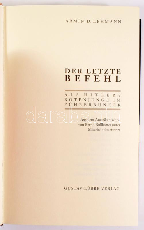 Armin D. Lehmann: Der Letzte Befehl. Als Hitlers Botenjunge im Führerbunker. Bergisch Gladbach, 2003, Gustav Lübbe. Német nyelven. Gazdag képanyaggal illusztrált. Kiadói kartonált papírkötés, kiadói papír védőborítóban.