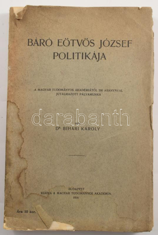 Dr. Bihari Károly: Báró Eötvös József politikája. Bp., 1916, MTA. 386p. Kiadói sérült papírkötés, kopottas állapotban.