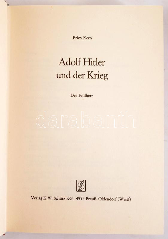 Erich Kern: Adolf Hitler und der Krieg. Der Feldherr. Preuß. Oldendorf,1978,K. W. Schütz KG. Német nyelven. Gazdag képanyaggal illusztrált. Kiadói egészvászon-kötés, szakadt kiadói papír védőborítóban.