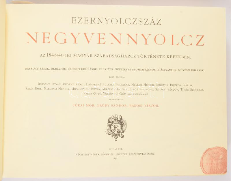 Ezernyolczszáz negyvennyolcz. Az 1848/49-iki magyar szabadságharcz története képekben. Szerk.: Jókai Mór, Bródy Sándor, Rákosi Viktor. (Reprint.) Bp., [1998], Kossuth. Az 1898. évi Révai-kiadás hasonmása, kísérőtanulmánnyal. Kiadói egészvászon-kötés, jó állapotban, kissé foltos, kopottas kiadói kartontokban.
