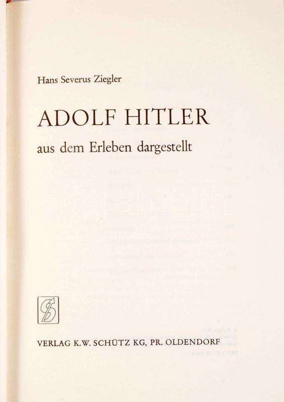 Hans Severus Ziegler: Adolf Hitler aus dem Erleben dargestellt. Oldendorf,1977,K. W. Schütz KG. Német nyelven. Fekete-fehér képanyaggal illusztrált. Kiadói egészvászon-kötés, kiadói papír védőborítóban.