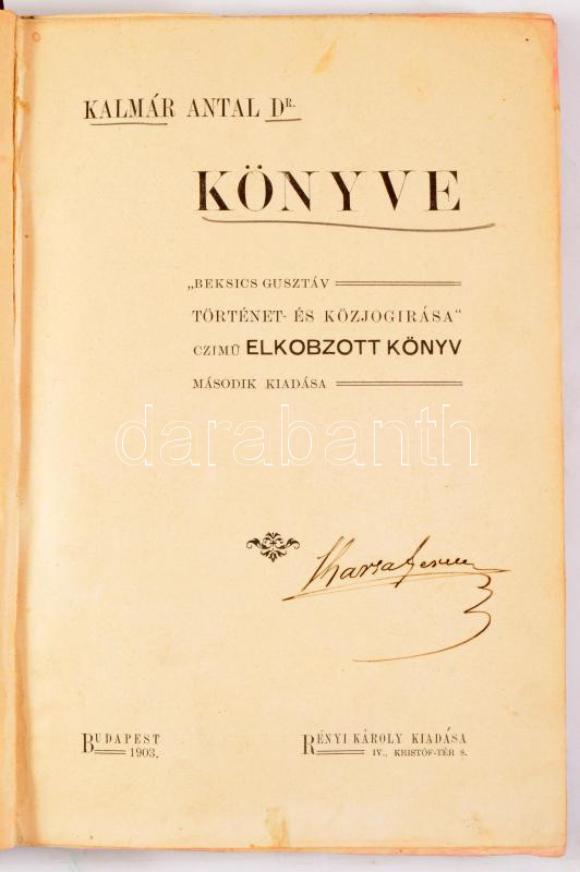 Kalmár Antal: - - Dr. könyve. "Beksics Gusztáv történet- és közjogírása" czímű elkobzott könyv második kiadása. Bp.,1903, Rényi Károly, XXVII+395 p. A könyv első kiadását elkobozták, és szerzője felségsértés miatt hat havi börtönbüntetést kapott.