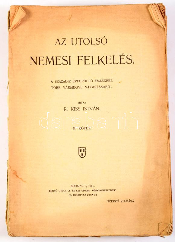 Kiss István, R[ugonfalvi]: Az utolsó nemesi felkelés. A századik évfordulója emlékére több vármegye megbizásából szerkeszti --. II. kötet. Bp., 1911., Benkő Gyula, VIII+408 p. + 3 t. Kiadói papírkötésben, sérült, széteső állapotban, kis részben felvágatlan lapokkal.