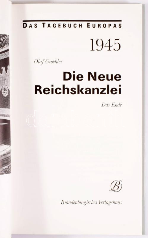 Olaf Groehl: Die Neue Reichskanzlei. Das Endre. Das Tagebuch Europas 1945. Berlin, 1995, Brandenburgisches Verlagshaus. Német nyelven. Fekete-fehér képanyaggal illusztrált. Kiadói egészvászon-kötés, kiadói papír védőborítóban.