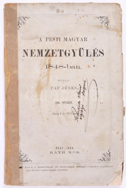 Pap Dénes: A magyar nemzetgyűlés Pesten 1848-ban. III. köt. Pest, 1866, Ráth Mór (Veszprém, Ramazetter Károly-ny.), 4 sztl. lev.+321-439p,m + I. kötet 1-40. oldalak Kiadói papírkötésben, felvágatlan lapokkal, ragasztott gerinccel.