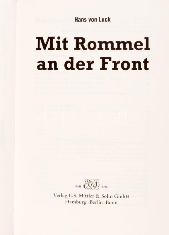 Hans von Luck: Mit Rommel and der Front. Hamburg-Berlin-Bonn, 2006, E. S. Mittler & Sohn. Német nyelven. Fekete-fehér képanyaggal illusztrált. Kiadói kartonált papírkötés.