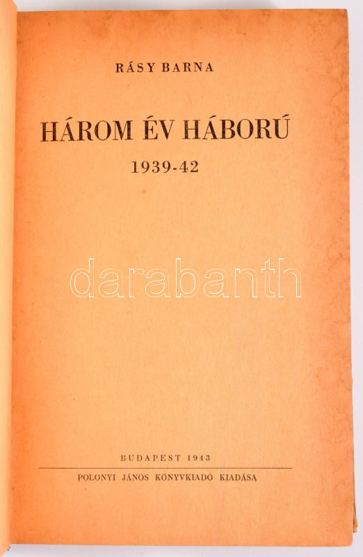 Rásy Barna: Három év háború, 1939-42. Bp., 1943, Polonyi János. Kiadói félvászon kötésben, 388 + (6) p