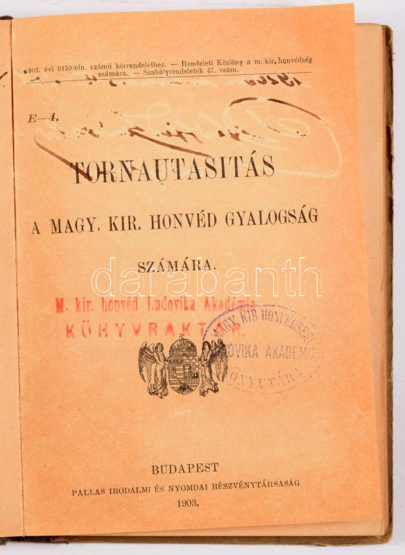 Tornautasítás a magyar királyi honvéd gyalogság számára. Bp., 1903, Pallas, 113 p. Korabeli kopott félvászon-kötés, kopott, foltos borítóval, a hátsó táblán rajzzal, régi Ludovikás bélyegzésekkel, névbejegyzésekkel: Rejtő Gyula főhadnagy, Pfeffer László (1920.)