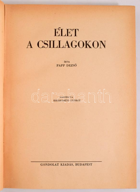 3 db csillagászati témájú könyv: Sztrókay Kálmán: Az ember és a csillagok. Say Kornél rajzaival. Bp., 1943, Athenaeum. Kiadói félvászon-kötés, jó állapotban, erÅ‘sebben sérült kiadói papÃr védÅ‘borÃtóban. + Papp DezsÅ‘: Élet a csillagokon. Ford.: Kecskeméti György. Bp., 1945, Gondolat. Kiadói félvászon-kötés, sérült kiadói papÃr védÅ‘borÃtóban. + Perelman, J. I.: A végtelen csillagvilág. Ford.: P. Tarczay Gizella. Bp., [1949], Dante. Kiadói félvászon-kötés, kissé sérült, foltos kiadói papÃr védÅ‘borÃtóban.
