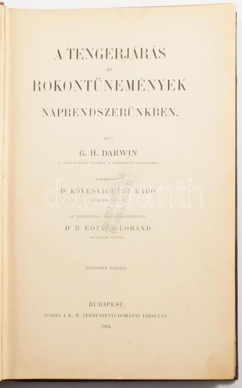 Darwin, G. H.: A tengerjárás és rokontünemények naprendszerünkben. Ötvenkét rajzzal. Bp., 1904, K. M. Természettudományi Társulat. 308p. Kiadói egészvászon kötés, kopottas állapotban.