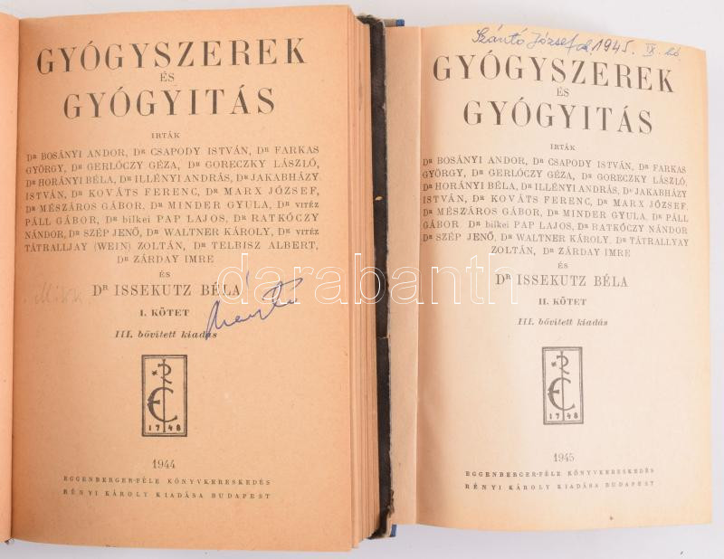 Dr. Issekutz Béla: Gyógyszerek és gyógyítás I-II. 1944-1945, Eggenberger, félvászon kötés, folttal, kopással.