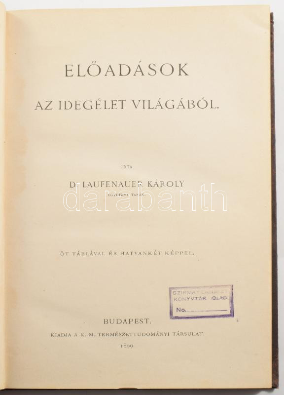 Laufenauer Károly dr.: Előadások az idegélet világából. Öt táblával és hatvankét képpel. Budapest. 1899, Természettudományi Társulat. Dombornyomott, egészvászon kötésben, kopottas állapotban.