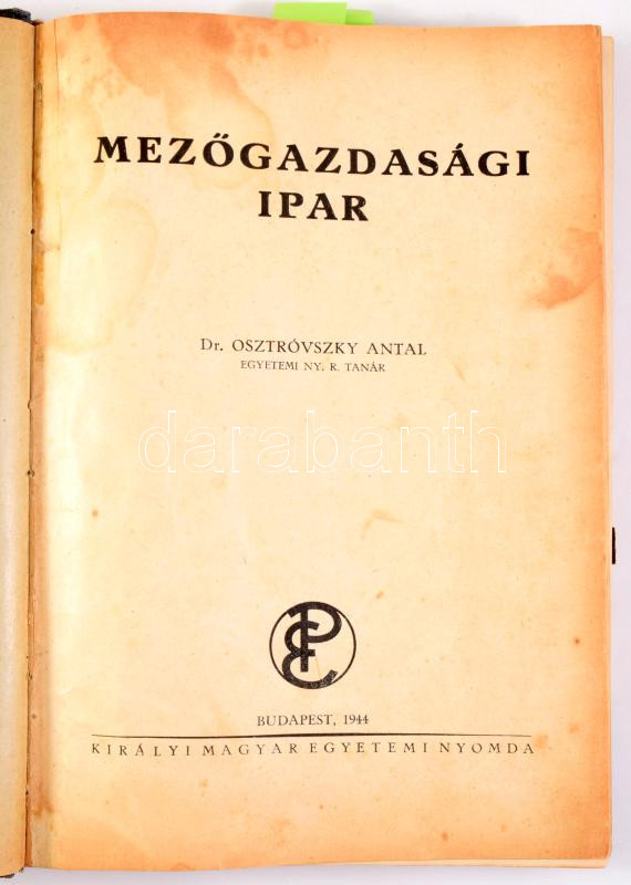Osztróvszky Antal: Mezőgazdasági ipar. Bp., 1944, Kir. M. Egyetemi Nyomda, 439+1 p. Fekete-fehér illusztrációkkal. Átkötött félvászon-kötés, foltos lapokkal.