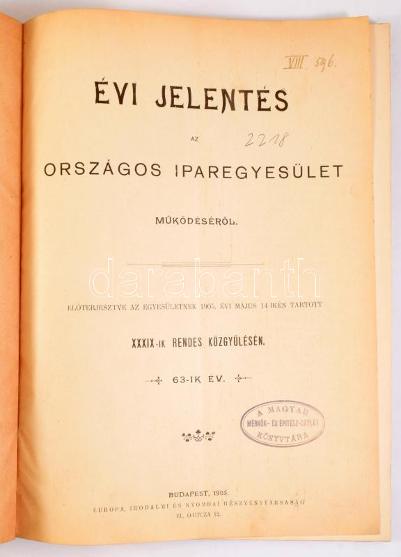 1901-1905 Évi jelentés az Országos Iparegyesület működéséről. 59-ik és 63-ik év. (2 kötet). Bp., 1901-1905, Neumayer Ede-ny./Europa-ny., 103+[1] p.; 102+[2] p. Félvászon-kötésben, kissé viseltes borítóval, intézményi bélyegzőkkel.