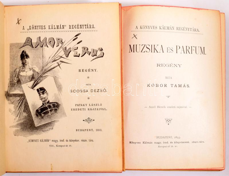A Könyves Kálmán Regénytára sorozat 2 kötete: Kóbor Tamás: Muzsika és parfum. Aczél Henrik rajzaival.; Scossa Dezső: Amor verus. Pataky László rajzaival. Bp., 1893, Könyves Kálmán, 173+[3] p.; 159+[1] p. Kiadói aranyozott, festett egészvászon sorozatkötés, Leszik-kötés, nagyrészt jó állapotban, az egyik kötet kissé foltos hátsó borítóval.