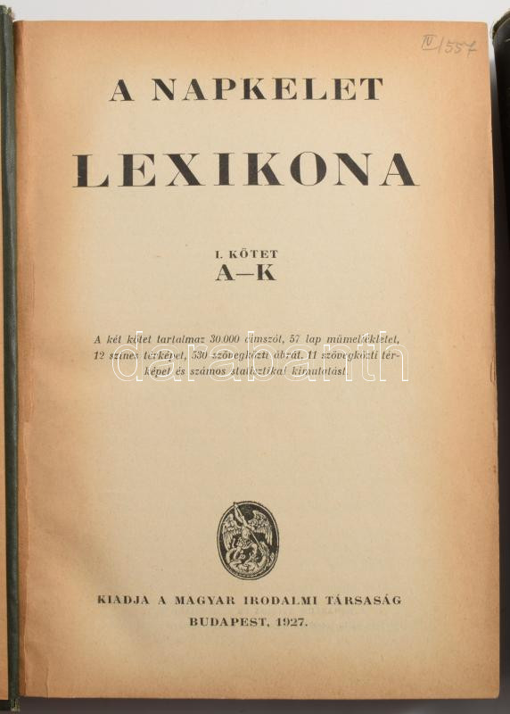 A Napkelet Lexikona I-II. kötet. Bp., 1927, Magyar Irodalmi Társaság. Kiadói egészvászon kötés, gerinc sérült, előzéklap kiszakadt, kopottas állapotban.