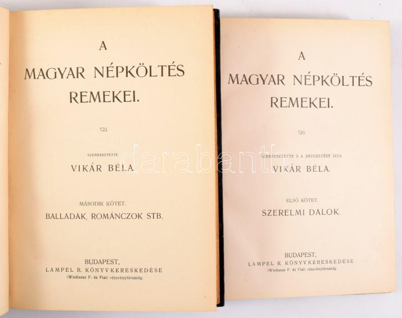 A magyar népköltés remekei I-II. (Remekírók Képes Könyvtára) Szerk. bev. Vikár Béla. Bp., é.n., Lampel R. (Wodianer F. és Fiai). Leszik-féle szecessziós aranyozott egészvászon kötésben, kortárs művészek illusztrációival, jó állapotban.