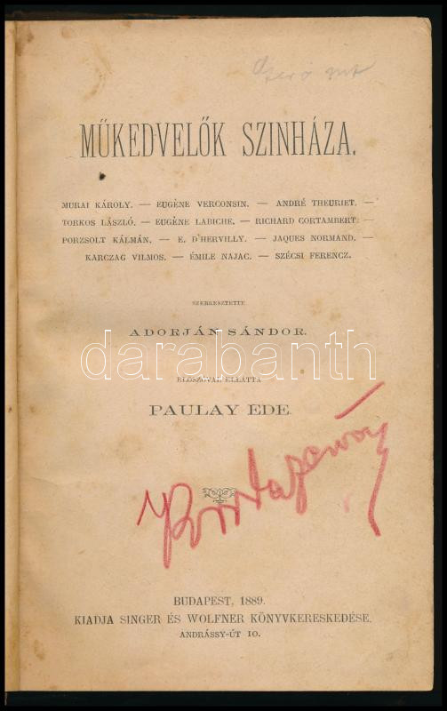 Adorján Sándor (szerk.): Műkedvelők szinháza. Paulay Ede előszavával. Bp., 1889, Singer és Wolfner, [4]+290+[2] p. Átkötött félvászon-kötésben, kissé sérült, kopottas borítóval, helyenként kissé foltos lapokkal, tulajdonosi névbejegyzéssel.