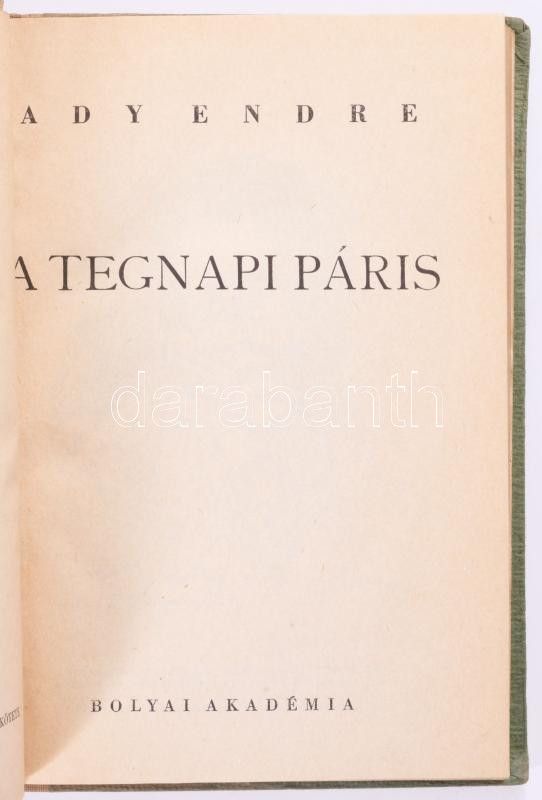 Ady Endre: A tegnapi Páris. Bp., Bolyai Akadémia. Félvászon kötés, kissé kopottas állapotban.
