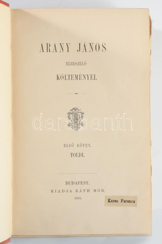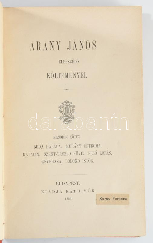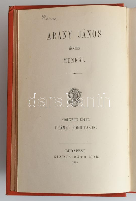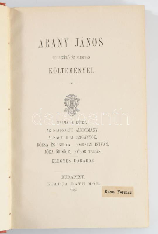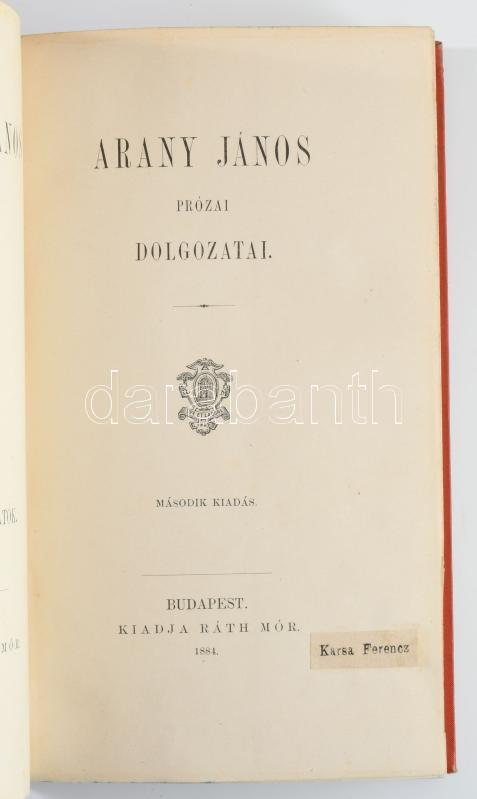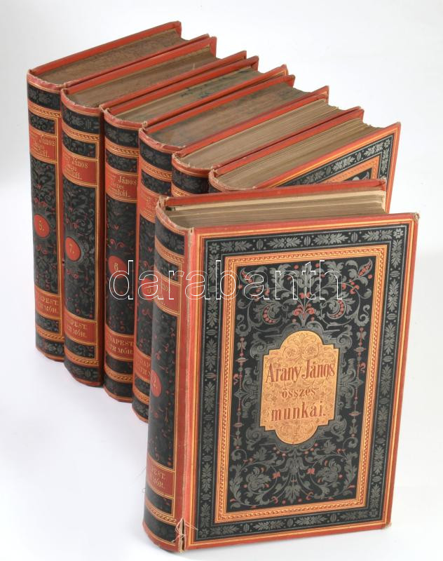 Arany János összes munkái 2-8 kötet. Bp., 1883-1885, Ráth Mór. Kiadói aranyozott, festett egészvászon-kötések, márványozott lapélekkel, a 2. kötet gerince sérült és egy lap kijár, kissé kopott borítókkal, a gerinceken néhány apró sérüléssel.