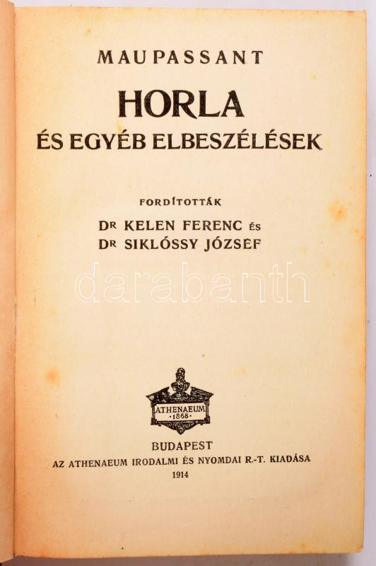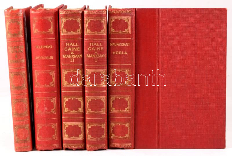 Athenaeum Könyvtár sorozat 5 kötete: Caine, [Thomas Henry] Hall: A manxman. I-II. köt. Ford.: Balla Mihály.; Heijermans, Herman: A vörös kalóz. - A fecske család a levegőben. Ford.: Balla Mihály.; [Kataev] Katajev, Valentin: A sikkasztók. Ford.: Sárközi György.; Maupassant, [Guy de]: Horla és egyéb elbeszélések. Ford.: Kelen Ferenc és Siklóssy József.; Bp., 1913-[1929], Athenaeum. Aranyozott gerincű, piros egészvászon-kötésben, vegyes állapotban.