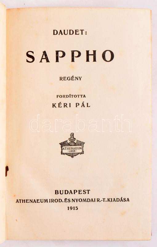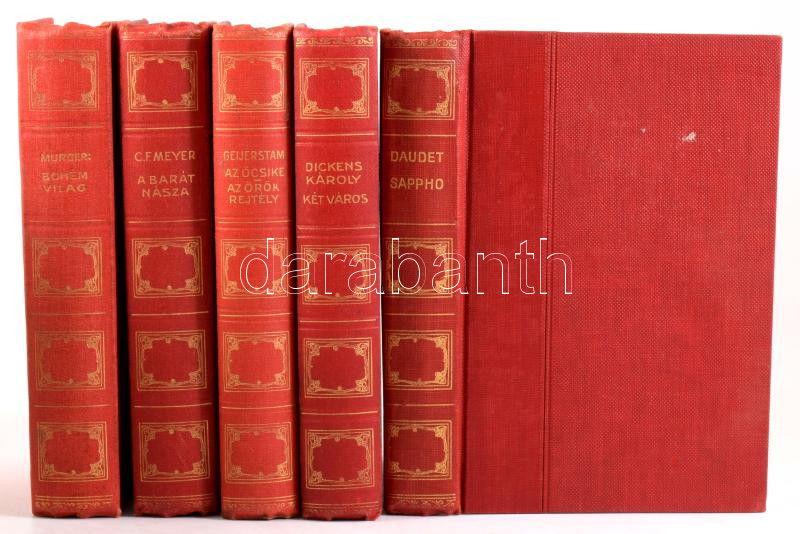 Athenaeum Könyvtár sorozat 5 kötete: Daudet, [Alphonse]: Sappho. Ford.: Kéri Pál.; Dickens, [Charles] Károly: Két város. Ford.: Bálint Mihály.; Geijerstam, Gustav af: Az öcsike. Egy házasság története. - Az örök rejtély.; Meyer, [Conrad Ferdinand]: A barát násza és egyéb novellák. Ford.: Lányi Géza Viktor.; Murger, Henry: Bohémvilág. Ford.: Komor Gyula. Bp., 1913-1915, Athenaeum. Aranyozott gerincű, piros egészvászon-kötésben, vegyes állapotban.