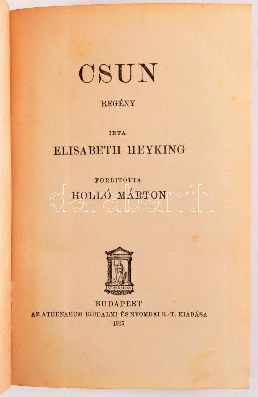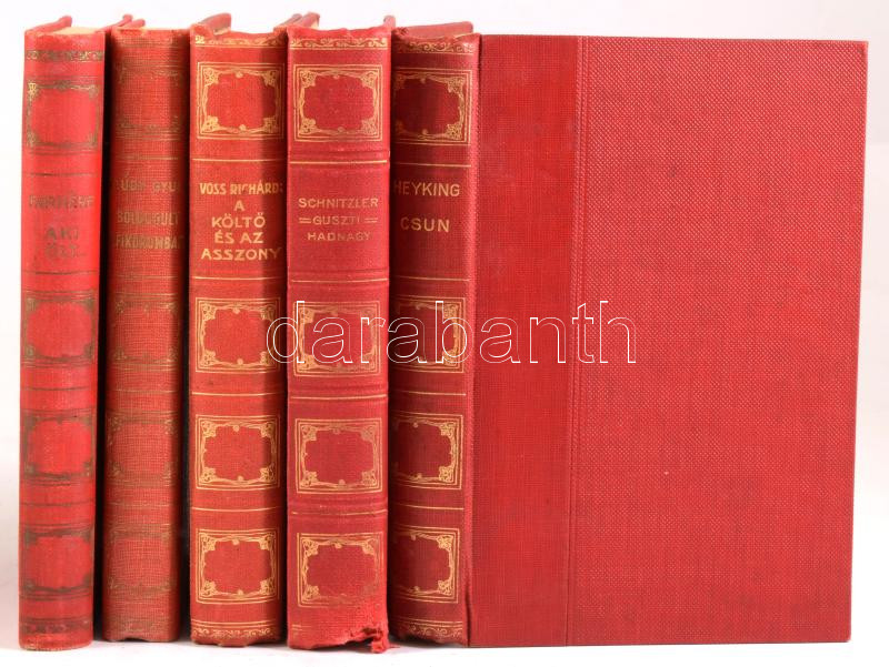 Athenaeum Könyvtár sorozat 5 kötete: Farrere, Claude: Aki ölt... Ford.: Kosztolányi Dezső.; Heyking, Elisabeth: Csun. Ford.: Holló Márton.; Krúdy Gyula: Boldogult úrfikoromban...; Schintzler, Arthur: Guszti hadnagy és egyéb elbeszélések. Ford.: Roboz Andorné.; Voss, Richard: A költő és az asszony. (A falconieri villa.) Ford.: Gerő Attila. Bp., 1913-[1930], Athenaeum. Aranyozott gerincű, piros egészvászon-kötésben, vegyes állapotban.