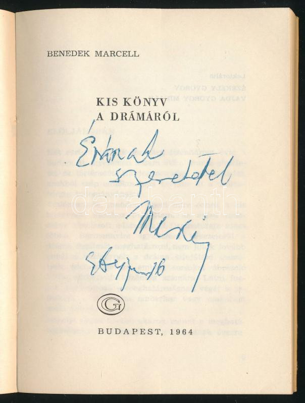 Benedek Marcell: Kis könyv a drámáról. DEDIKÁLT! Bp., 1964, Gondolat. Kiadói papírkötés.
