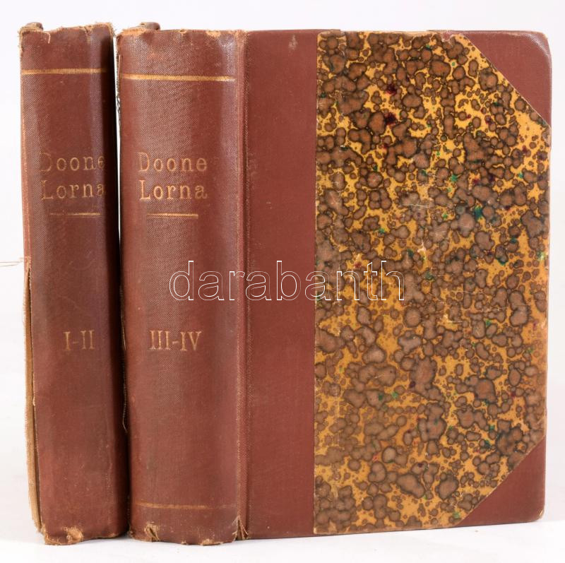 Blackmore R. D.: Doone Lorna. Regény Exmoorból. I-IV. köt. Ford.: Mudrony Pál. Bp., 1875, Athenaeum, 247+3;+276+1 p.; 277+3;+271+1 p. Átkötött félvászon-kötések, kopott borítókkal, sérült gerincekkel, kijáró lapokkal, néhány sérült lappal.