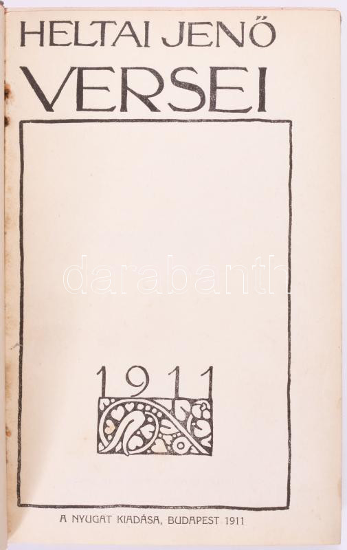Heltai Jenő versei. Bp., 1911, Nyugat 123 p. Első kiadás. A címlapot Falus Elek rajzolta. Félvászon kötés, belül a gerincnél levált, kopottas állapotban.