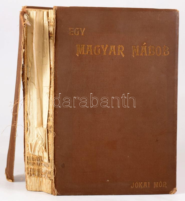 Jókai Mór: Egy magyar nábob. Képes díszkiadás. Goró Lajos hatvankét szövegrajzával, és nyolc aquarelljével. Bp., 1894, Athenaeum, 1 t.+XII+500+2 p.+ 8 t. Korabeli aranyozott egészvászon-kötés, sérült gerinccel, kopott borítóval, kijáró lapokkal (az elülső szennylapotól VI-ig.)