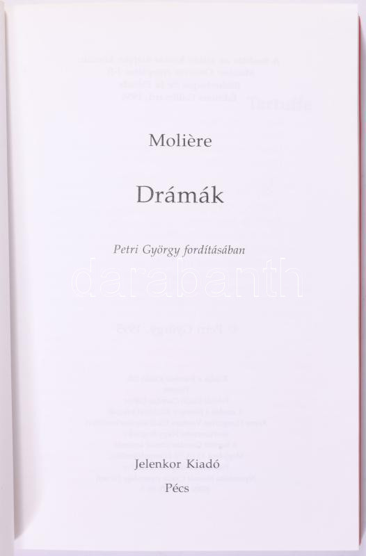 Moliére: Tartuffe, Don Juna, A mizantróp. Petri György fordításában. Pécs, 1995, Jelenkor. Kiadói papírkötés, jó állapotban.