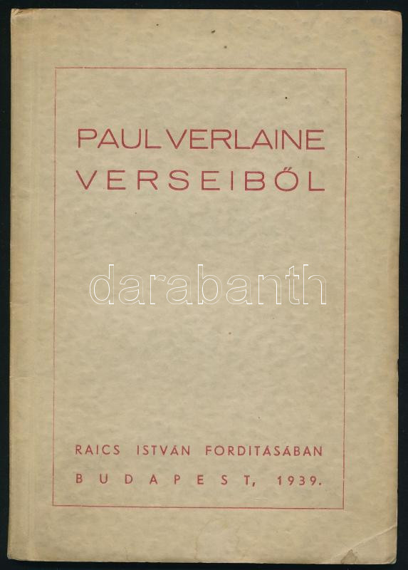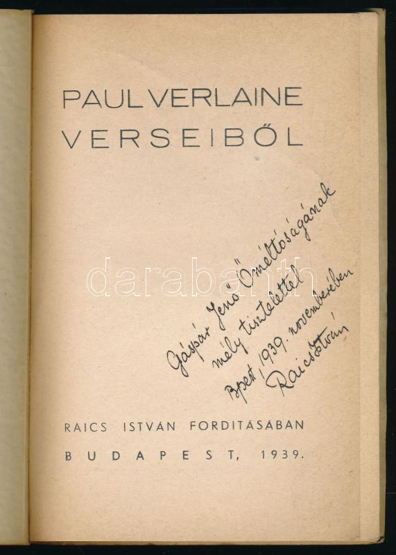 Paul Verlaine verseiből. Bp., 1939. Raics István fordításában. A fordító által DEDIKÁLT! Kiadói papírkötés, jó állapotban.