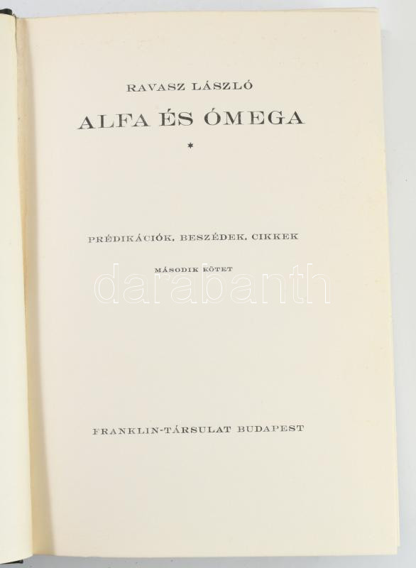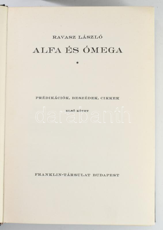 Ravasz László: Alfa és ómega. Prédikációk, beszédek, cikkek. I-II. köt. Bp., [1933], Franklin, X+2+383 p.;VIII+2+383 p. 1. kiadás. Kiadói aranyozott egészvászon-kötések, kis kopásnyomokkal.