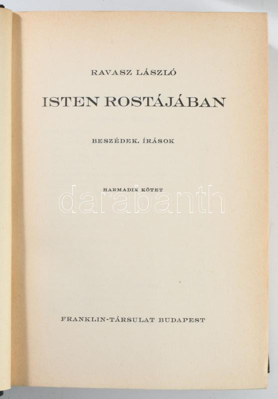 Ravasz László: Isten rostájában I-III. köt. Beszédek, írások. Bp.,[1941],Franklin, XII+498 p.; VIII+478 p.; VII+567 p. 1. kiadás. Kiadói aranyozott egészvászon-kötés, kissé kopott borítókkal, a III. kötet fűzése laza.